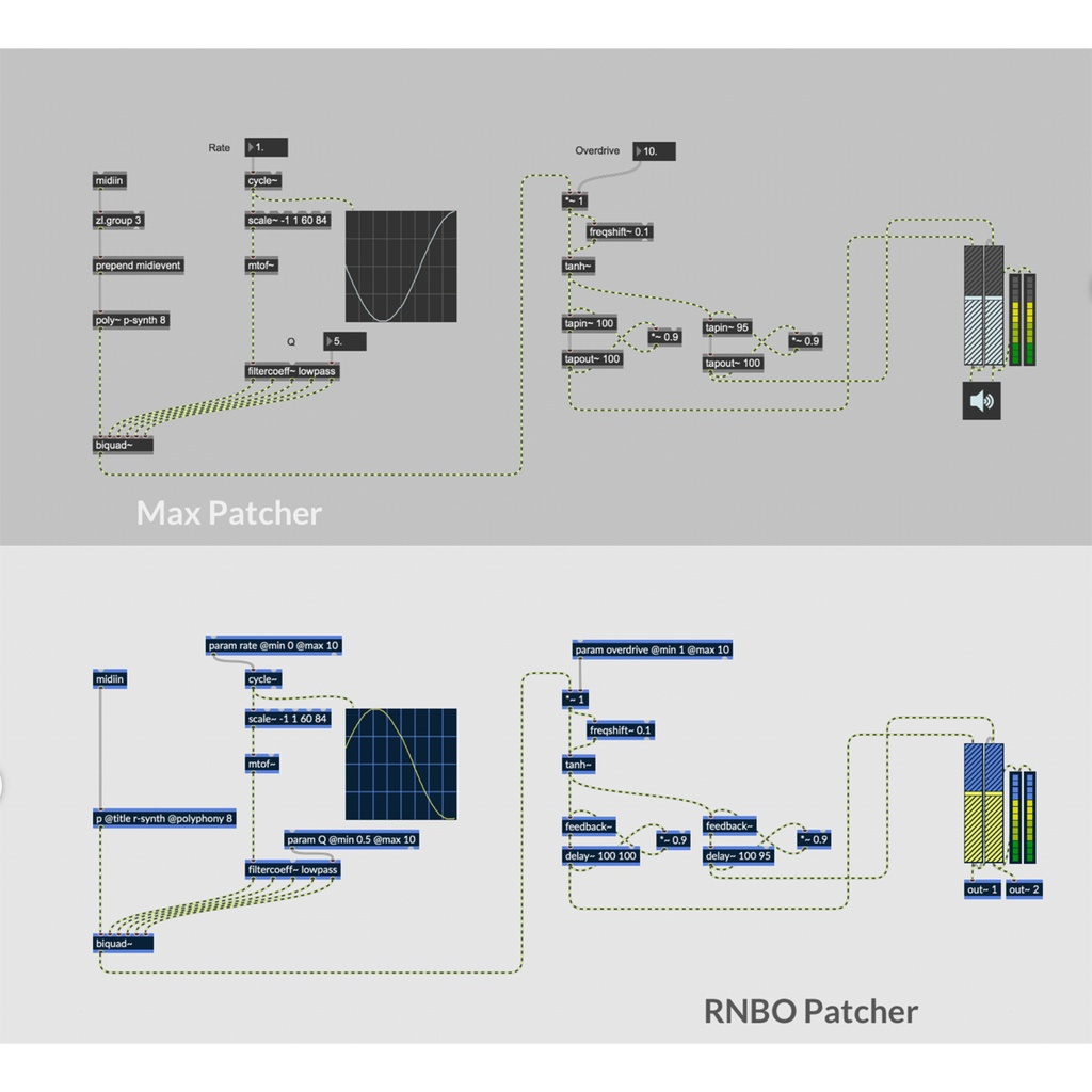 RNBOでパッチを適用している時に聴こえるサウンドは、変更を加えたときに更新されるジェネレートおよびコンパイルされたコードです。この実行中のコードは、エクスポートするコードと同じであるため、どのターゲットを選択しても開発は同じように聴こえます。