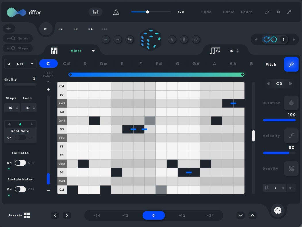 Rifferは、ピッチ、デュレーション、ベロシティ、密度を組み合わせて音楽のリフとシーケンスを生成するスマートMIDIツールです。サウンド、ソフトウェア、ハードウェア向けに構築されています。それらを独自のものに変えるか、無限モードを使用して無限に実行させます。