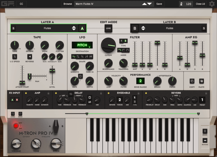 GForce のM-Tron Pro IVは、ビートルズ、レッド ツェッペリン、レディオヘッド、オアシス、トレント レズナー、トレンテモラー、AIR、ニルス フラームなどの著名なアーティストのレコーディングで使用されたことで有名なテープ ベースのキーボード、象徴的なメロトロン M400 を詳しく掘り下げています。その他。その独特のサウンドはプログレッシブ・ロックやインディー・ロックだけでなく、ローファイやヒップホップなどのジャンルでも幅広く活用されています。ビートルズの「ストロベリー フィールズ フォーエバー」の伝説的なイントロのフルートから、ムーディー ブルース、デヴィッド ボウイ、ローリング ストーンズの曲、そしてフレーミング リップス、ナイン インチ ネイルズ、モデスト マウス、ミューズ、U2、 Sigur Ros など、Mellotron M400 のサウンドが音楽史の深い部分であることは疑いの余地がありません。