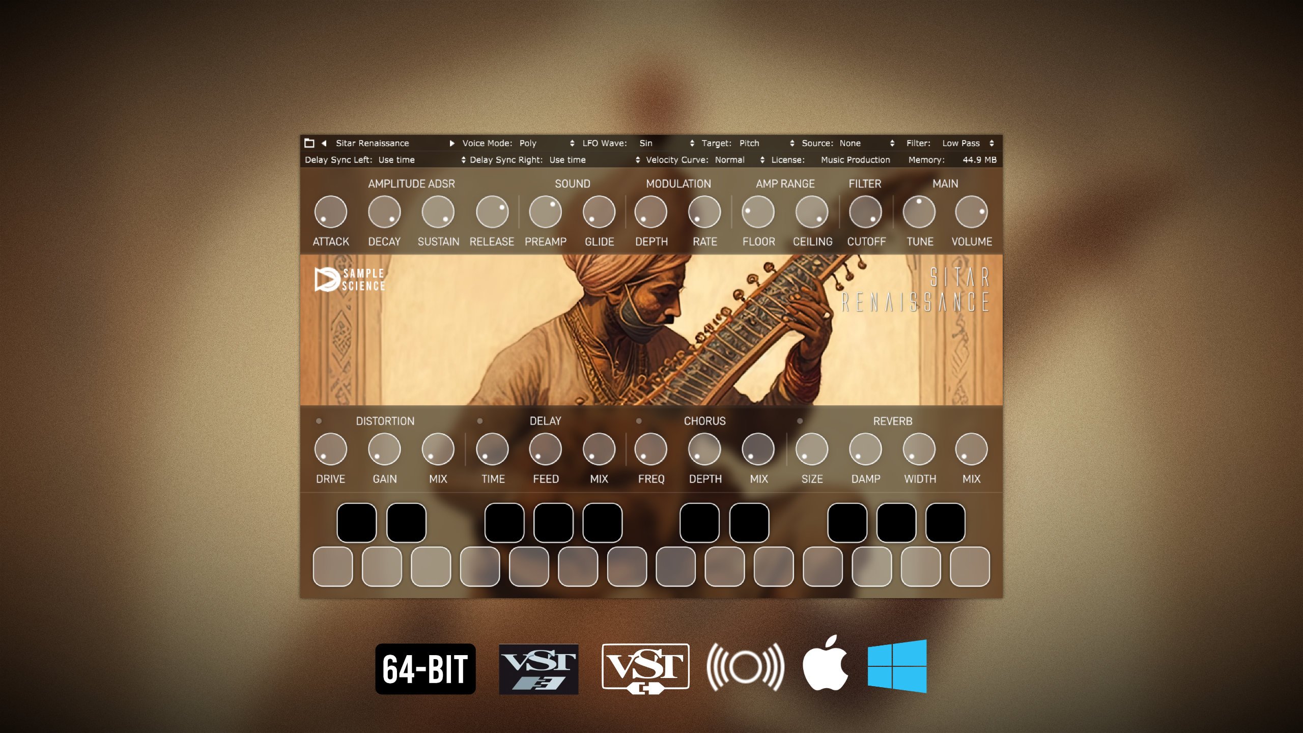 Sitar Renaissance は、復元された破損した弾かれたシタール録音をベースにした仮想楽器です。これらのシタール サンプルを優れたものにするために、スペクトル修復、適応ノイズ除去、手動再チューニングなどのオーディオ エンジニアリング技術の組み合わせが使用されています。その結果、独自のサウンドを持ち、使いやすく、ミックスを切り開くユニークな楽器が誕生しました。