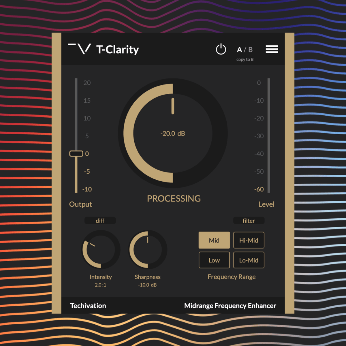 TechivationのT-De-Esserが高音域をクリーンアップし、音楽的で自然なサウンドに仕上げるように、T-Clarityは中低音域をクリーンアップし、クリアで滑らかな心地よいサウンドに仕上げます。一般的な音の濁りを直す方法は、EQを使って周波数をカットすることです。しかし、音源やミックスの一部でしか濁りが発生しない場合があるため、全体的なサウンドが変わってしまうという代償が伴います。T-Clarityは、音の質感を損なうことなく、このような問題を解決します。