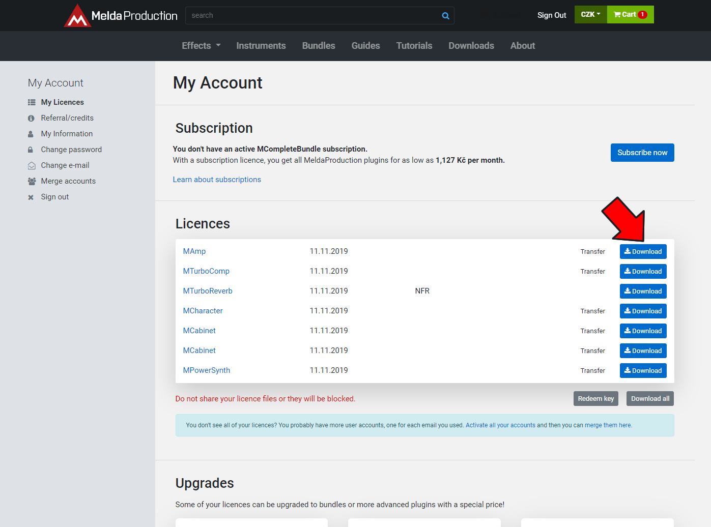 購入後はライセンス ファイルと手順が記載された電子メールが届きます。ライセンスはMeldaProductionのサイトでアカウントに紐づけされているので、ログインして、ライセンス ファイルをダウンロードすることができます。