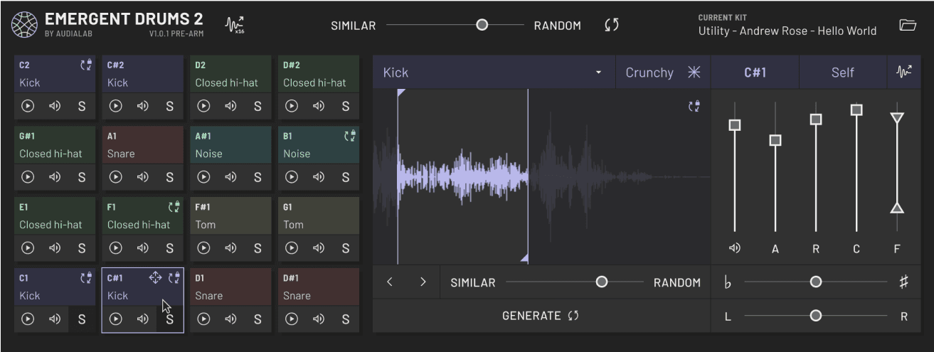 Emergent Drums はキックやスネア、クラップ、ハットをはじめとしたサンプルをゼロの状態から生成できてしまうすごいプラグイン。