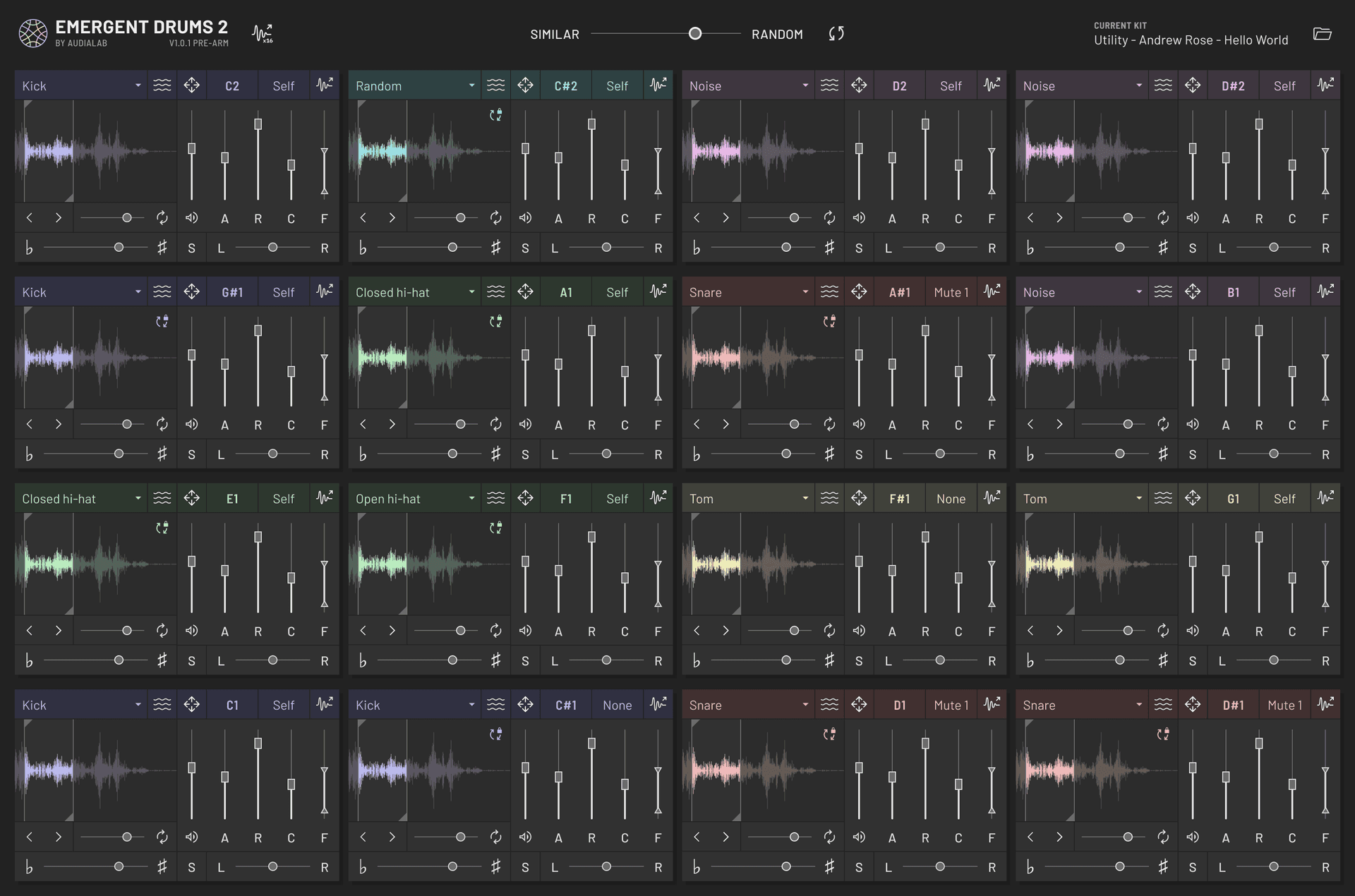 Emergent Drum 2の新しいデザインは、ワークフローを維持することに重点を置いています。美しく落ち着いた色とシンプルなヘッダー バーにより気が散ることがなく、シンプルで明確なコントロールにより、すべてを適切な位置に配置して大量のツールを操作できるようになります。