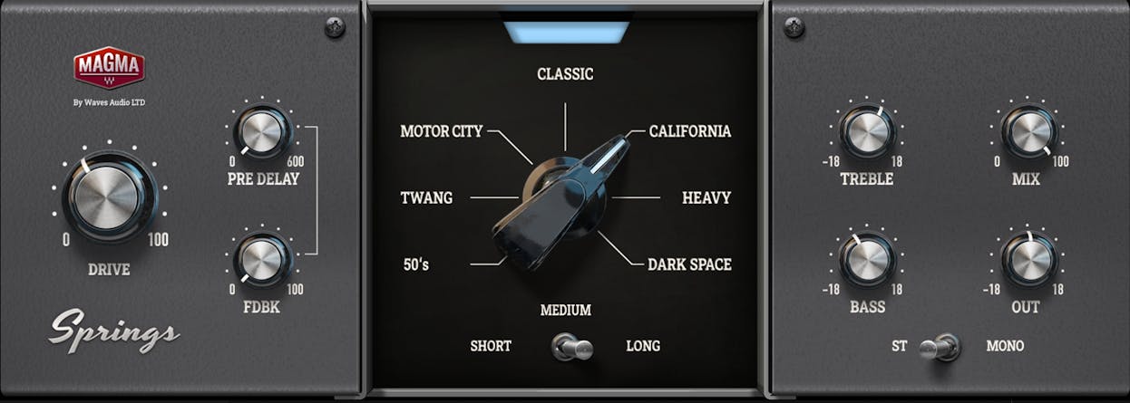 Waves「Magma Springsは7種類のスプリングリバーブユニットモデルに基づくスプリングリバーブプラグインで、正確の異なる7種類のスプリングリバーブモデルを中央のノブで選択します。