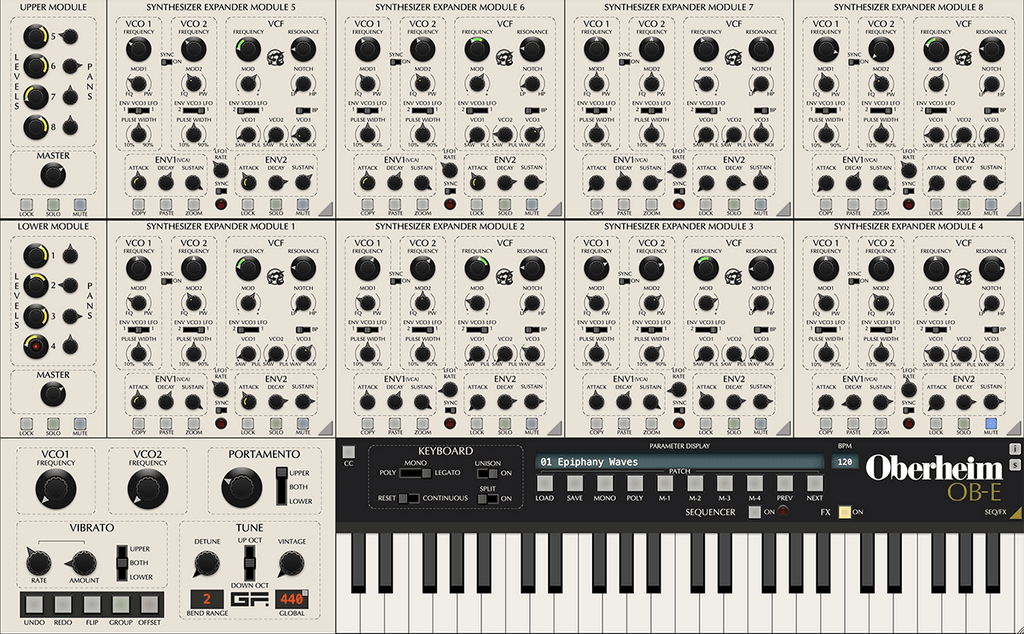 Oberheim OB-Eは、伝説的なOberheim®8-Voiceに対する私たちの見解であり、TomOberheimの個人的な支持を受けた最初のソフトウェア楽器です。OB-Eは単なるエミュレーションではなく、ユニークな音楽体験を提供します。巨大なサウンドで、象徴的なSynthesizer Expander Module(SEM®)ベースの8-Voice(別名EVS)を、多数の拡張機能と追加機能を介して新しい音の領域に取り入れます。8-Voiceの概念は実際には非常に単純です。パルス波形と鋸歯状波形を備えた2つのVCO、2つのADSエンベロープジェネレーター、1つのLFO、および魔法のマルチモードフィルターを含む単一のSEMに基づいています。単独では、各SEMはモノフォニックですが、8ボイスでは、ポリフォニックキーボードによってトリガーされる8つのSEMがあるため、優れた8ノートポリフォニックシンセサイザーがあります。