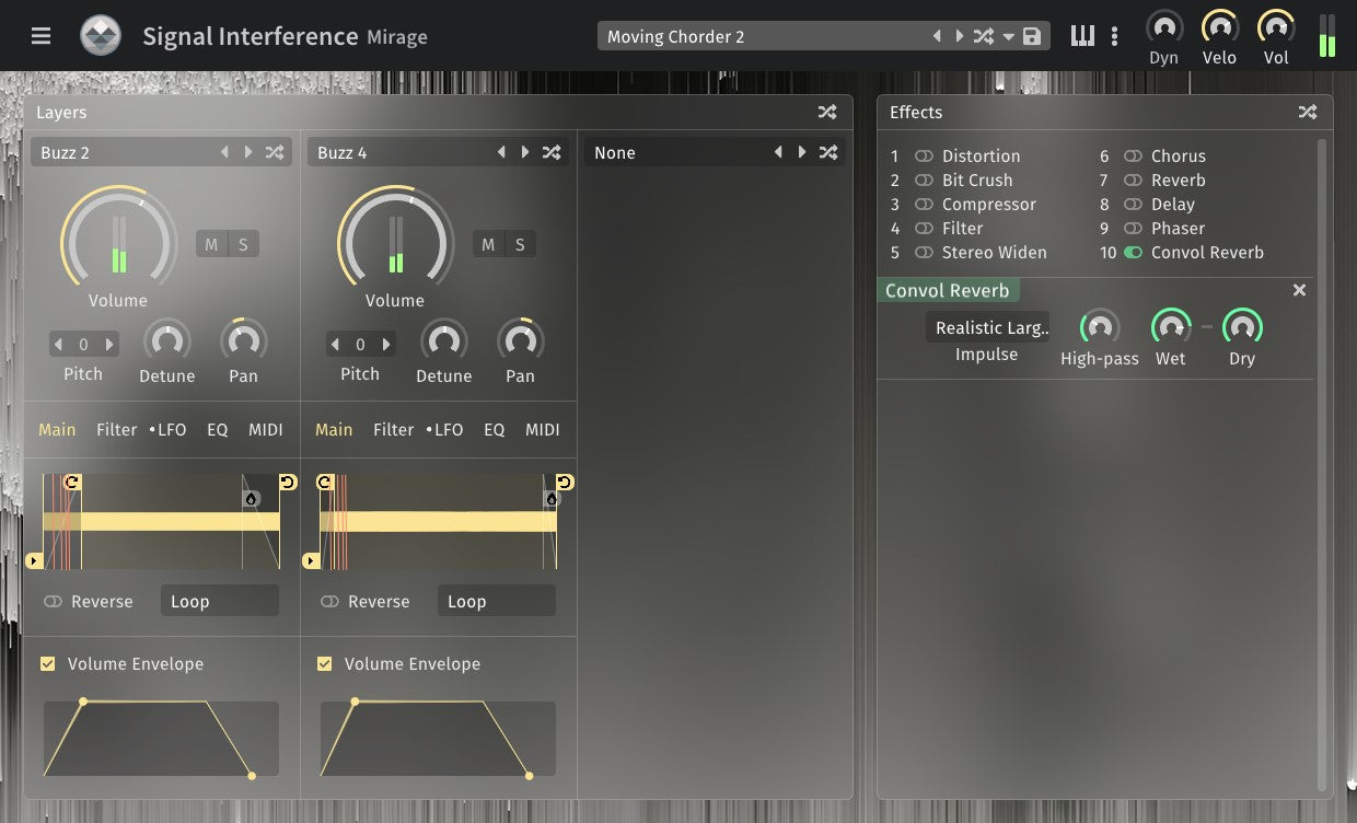 Mirage には、実空間シミュレーション用のリバーブとディレイ エフェクトもあります。これらはサウンド デザインにも最適です。リバーブ エフェクトの 1 つにコンボリューション リバーブがあります。これは通常、実空間のサンプル (インパルス応答とも呼ばれます) を使用して、信号にリアルな響きの残響を追加するために使用されます。Mirage には、クリエイティブなサウンド デザインのためのリアルなインパルス応答と抽象的なインパルス応答の両方が備わっています。