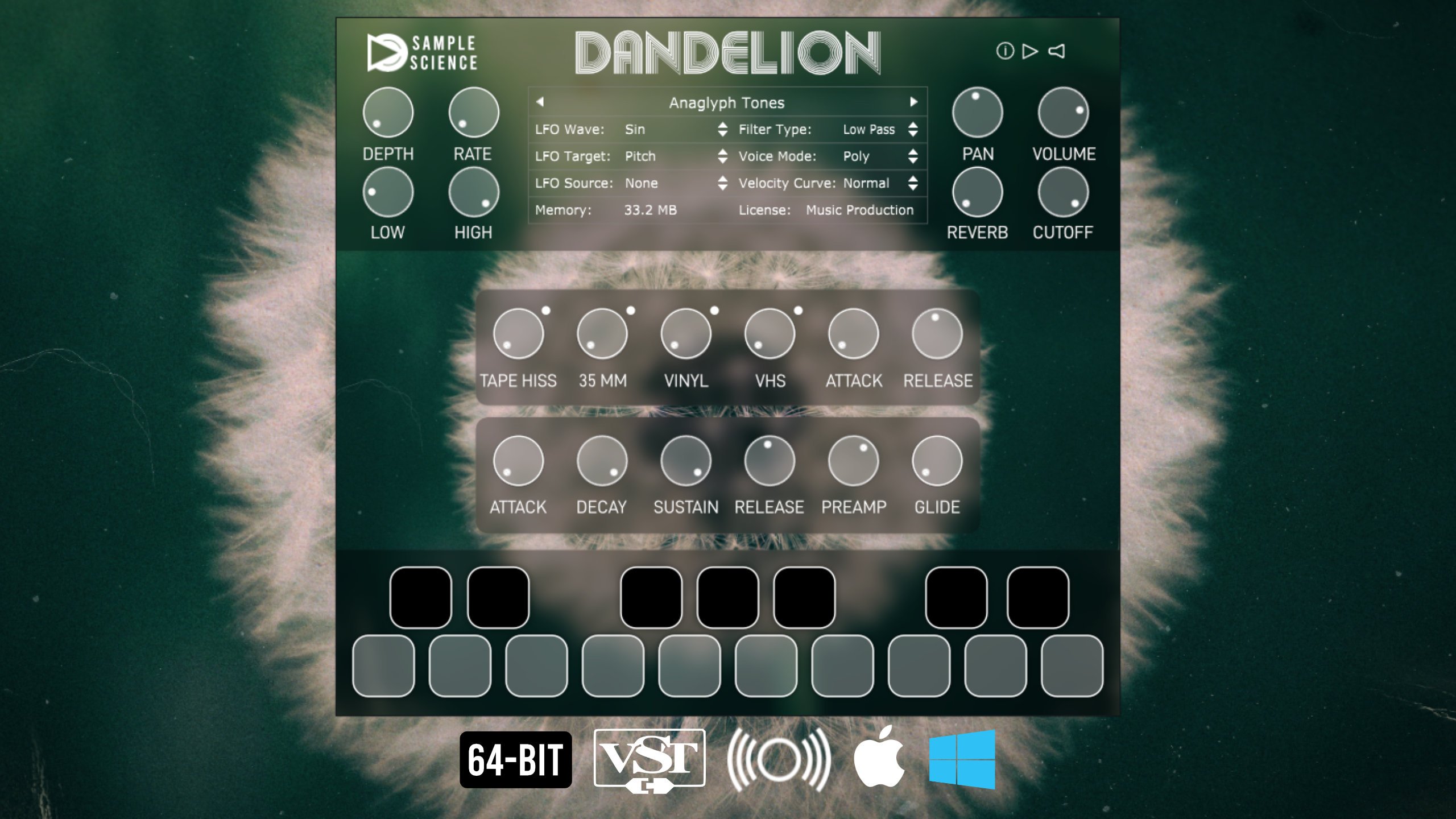 Dandelion は、レトロな雰囲気の音楽のための Lofi サウンド モジュールです。 含まれている 40 のマルチサンプル サウンドは、Boards of Canada、Lone、Lorn、Milieu、Tycho の音楽を思い出させます。 ロファイ ヒップホップ、ヴェイパーウェイヴ、アンビエント、ダウンテンポ、ダンジョン シンセなど、ローファイなダスティ サウンドを必要とする音楽ジャンルで使用できます。