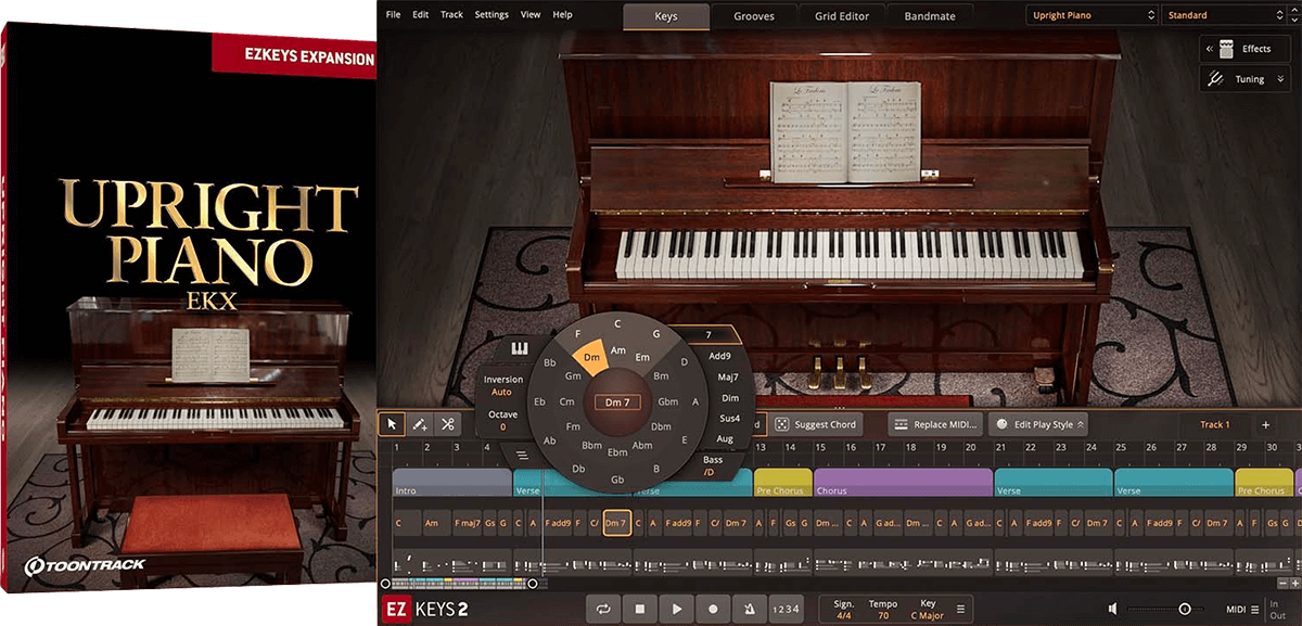 Toontrack「EZKeys Upright Piano」はジャズ、ブルース、バラードに最適のアップライトピアノ音源です。 Toontrackではおなじみのコードをカスタマイズできるフレーズ生成ライブラリが付属しており、ギターメインでピアノのフレーズづくりになれていない人でも、容易にフレーズを生成できるのが最大の特徴。