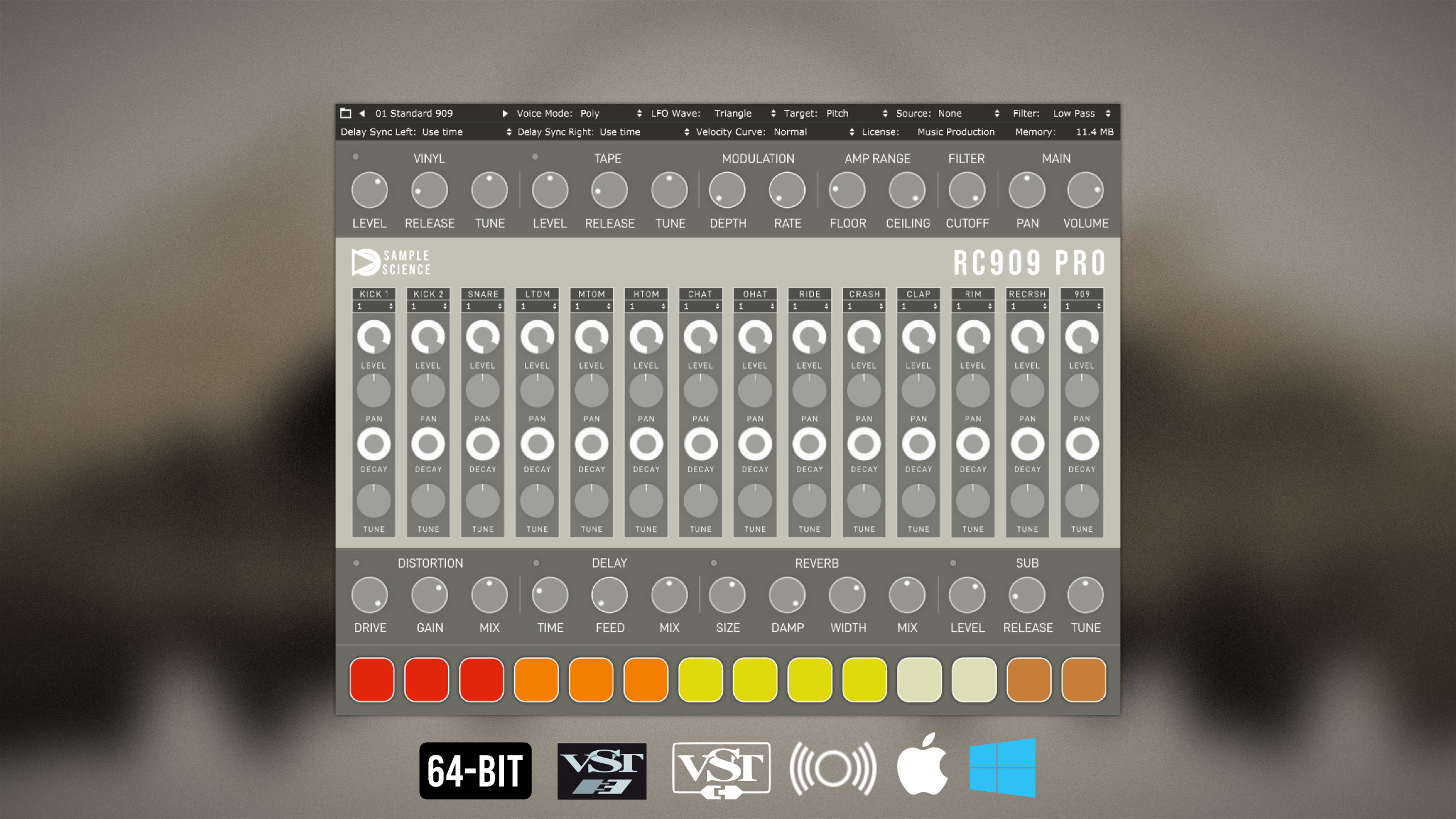 【24時間限定】TR-909をエミュレートしたドラムマシン音源 SampleScience「RC909 Pro」が67%OFF、9ドルになっております。