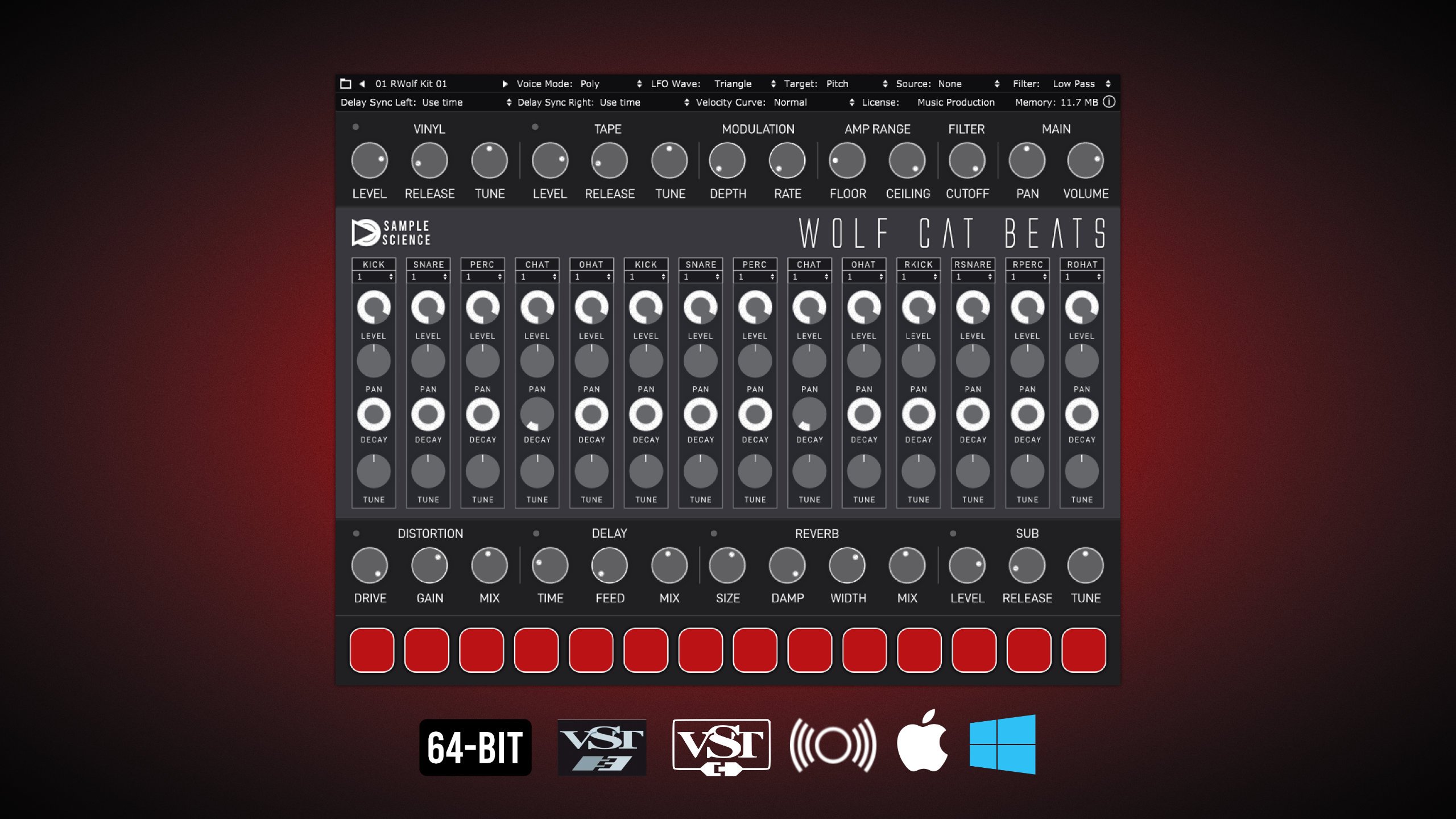Wolf Cat Beats は、2010 年代の悪名高い 2 台のアナログ ドラム マシンからサンプリングされた 22 のドラム キットを提供するプラグインです。 Wolf ドラムマシンの 14 個のドラムキットが含まれており、クリーンバージョンとギターペダルで処理されたバージョンの両方が利用可能です。 さらに、「The Cat」ドラムマシンからの 8 つの未処理ドラムキットも提供されます。