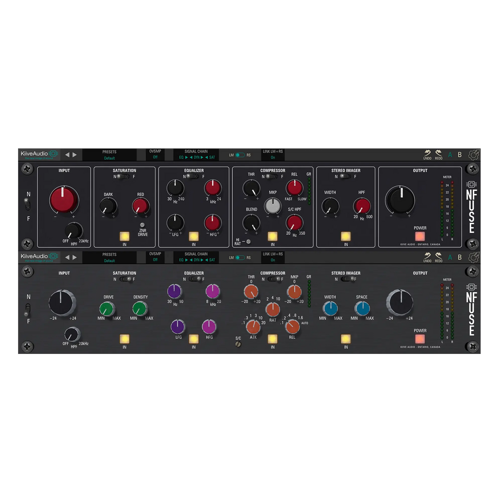 Kiive Audio「NFuse」はNeve Master Bus TransformerとSSL Fusionを組み合わせたバスプロセッサーです。バスプロセッサーということでサチュレーション、EQ、コンプレッサー、ステレオイメージャーとサウンドを整えるためのモジュールが搭載されている訳ですが、重要なポイントとしては、各モジュールごとにNeveとSSL Fusionの2つのモデルが用意されていて、N-Fのスイッチを切り替えることによって、瞬時にそのエフェクトのモジュールのみをもう片方のモデルに変えることが出来てしまうという仕組みになっています。もちろんこれら2のモジュールはサチュレーションの倍音構成、EQのカーブからして異なるわけで、瞬時に別のモデルで試すことができるというのは使い勝手も良く面白い設計。