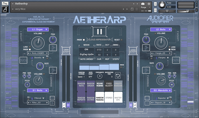 AetherArp は、4 つのサウンド エンジンとクラウド アルペジエーターを備えた強力なライブラリで、アンビエント プロダクションや映画音楽で、変化するサウンドスケープ、変化するサウンド、幻想的なムードを作成するのに最適です。