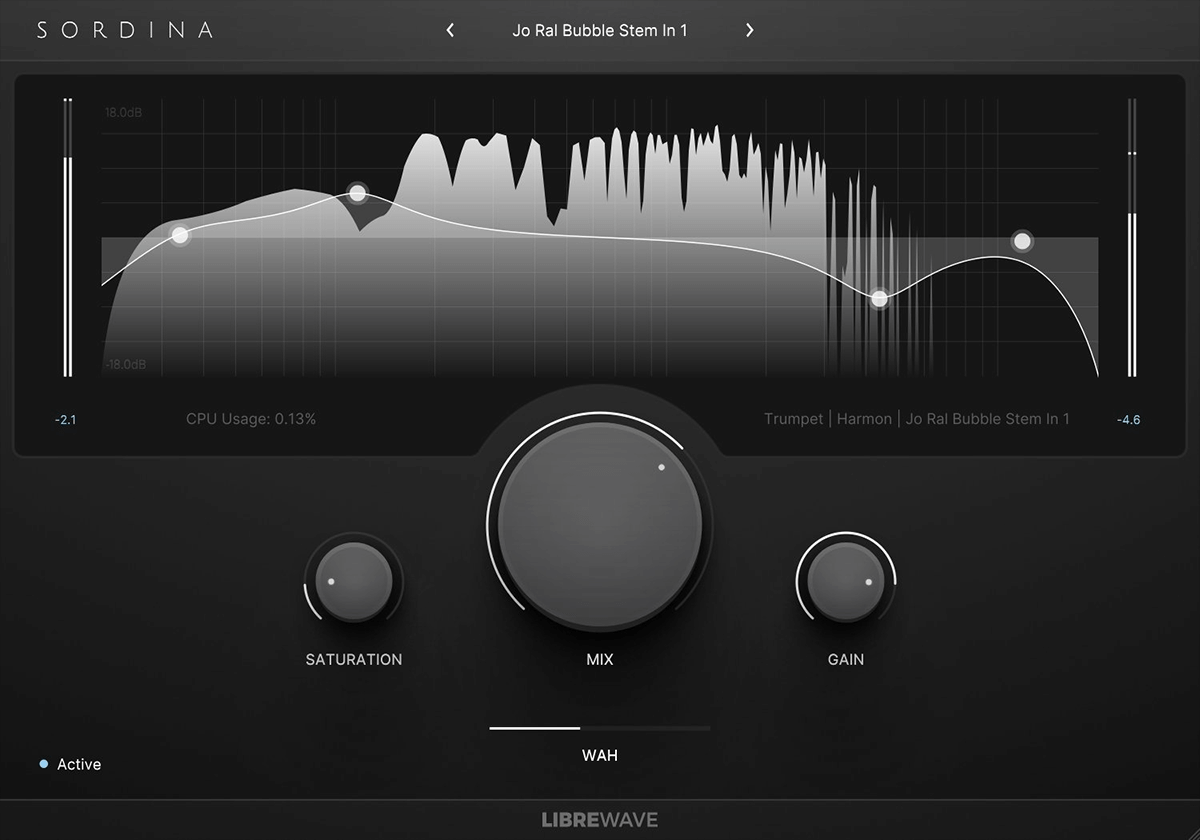 LIBREWAVE「Sordina – A Muted Instrument Emulator」はホーンセクションの楽器による通常奏法のヴァーチャルインストルメントやオーディオ録音に対し、ミュート奏法のサウンドに置き換えシュミレートできるエフェクトプラグインです。