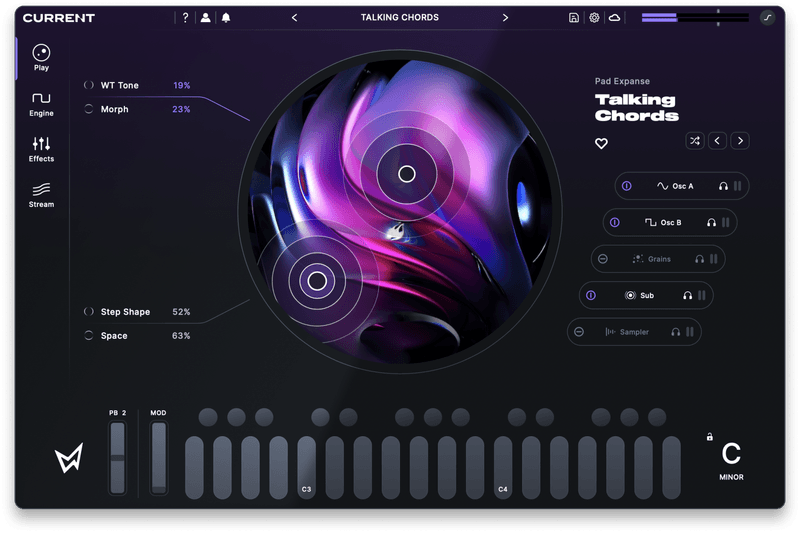 Current は、5 つの並列サウンド エンジン、広範なモジュレーション オプション、表現力豊かな MIDI エフェクト、FM 合成、高度なフィルタリングを中核に組み合わせ、統一されたサウンド デザイン エコシステムを構築します。