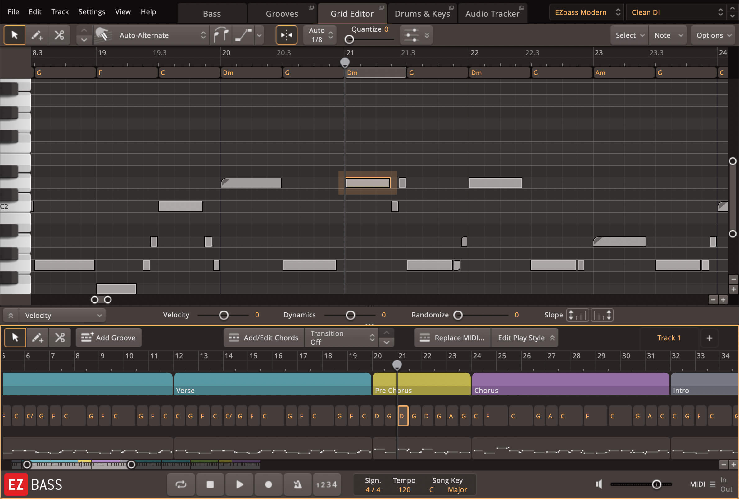 MIDIライブラリの機能性については大分EZBassに軍配が上がると思います。まず、EZBassにはMIDIライブラリのMIDIデータを並べて組み替えてプラグイン内でMIDIをつなげたシーケンスを作ることができます。また、プラグイン内でピアノロールを開きMIDIシーケンスを作りエクスポートできます。また、MIDIフレーズのノートを操作する複数の便利機能も備わっています。MIDI周りのアーティキュレーションもプラグイン内で設定して演奏ニュアンスを調整できるところがやはり良いですね。