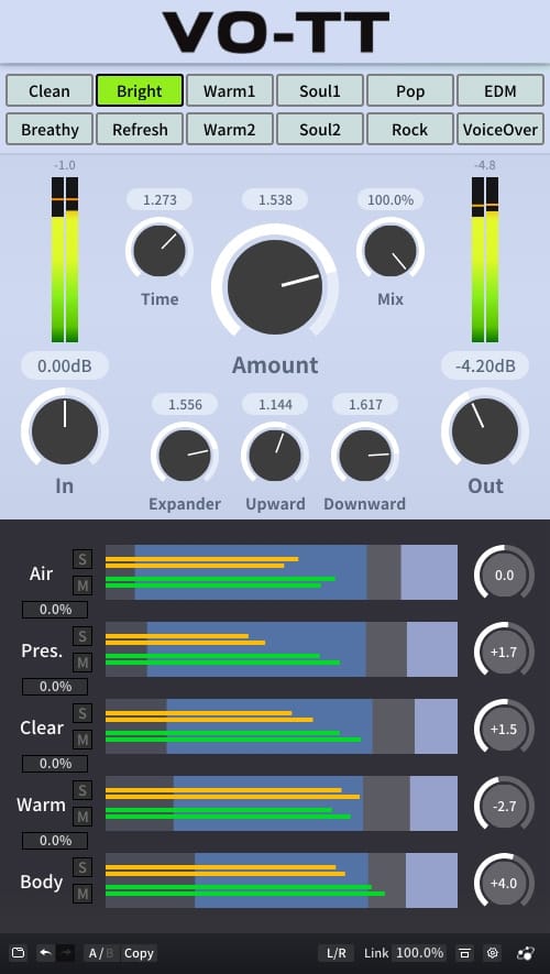 VO-TT (VOcal-oTT) は、ボーカル ミキシング用に独自に設計された直感的な OTT スタイルのマルチバンド ダイナミクス プロセッサです。